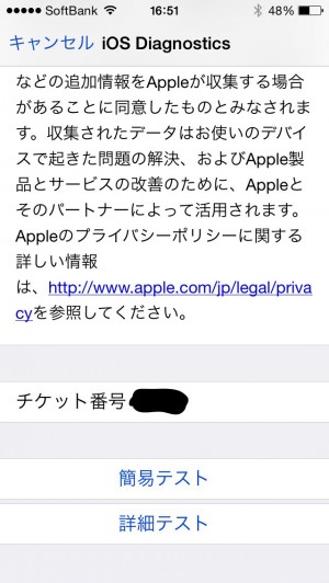 先ほど発行された「お問い合わせ番号」を伝え、バッテリーを交換できないか聞くと、サポートさんがボクのiPhoneの「詳細テスト」の結果を見ながら嬉しいひと言・・・