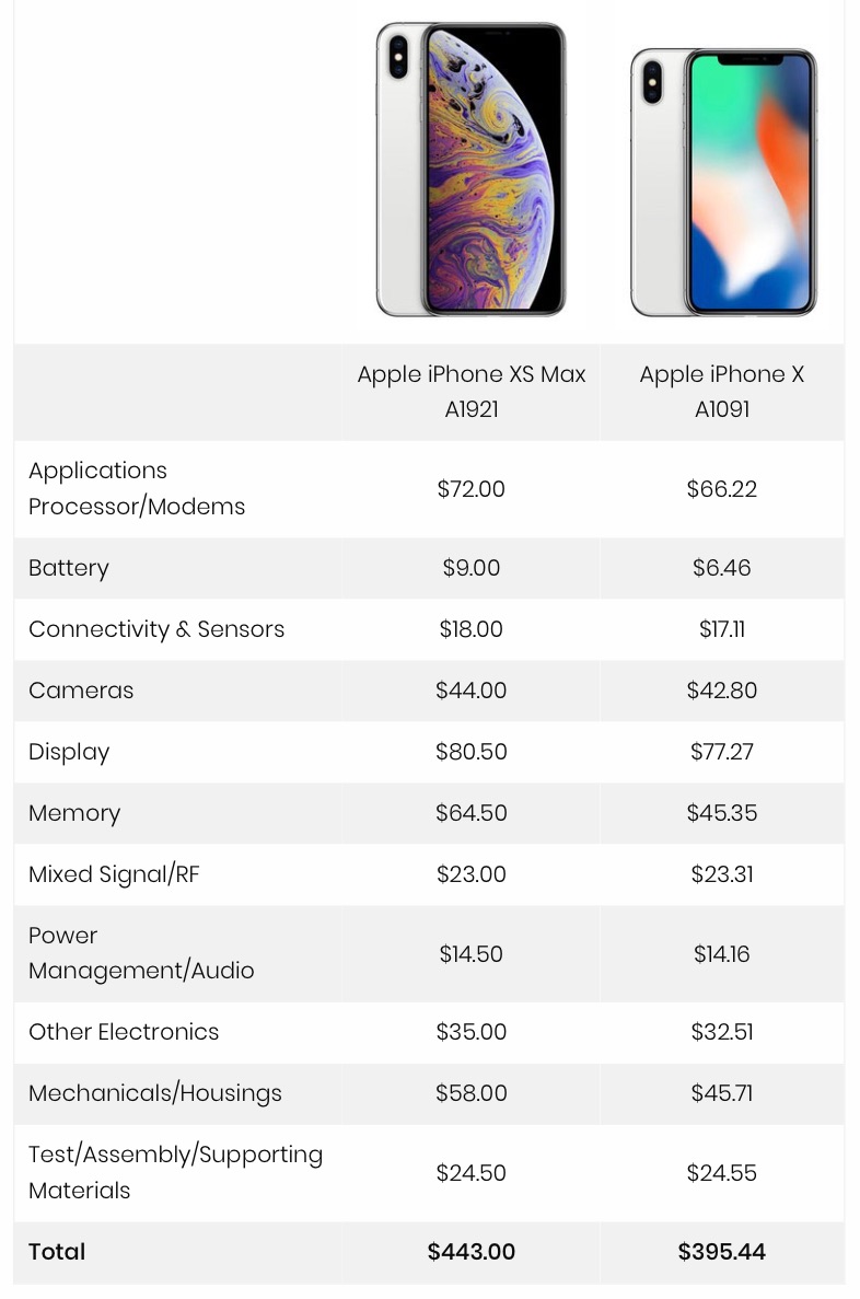 iPhone XS Max 256GBモデルの製造原価を TechInsightsが内部のパーツを分析し算出した結果、製造原価は 443ドル(約5万円)であると発表しています。