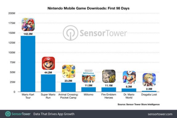 課金額はリリースから98日間の課金額とのことで、任天堂ゲーム史上1位はファイアーエムブレム ヒーローズで1億2,360万ドル(約133億5,930万円)、2位は7,510万ドル(約81億1,720万円)に達したマリオカート ツアーとのこと。