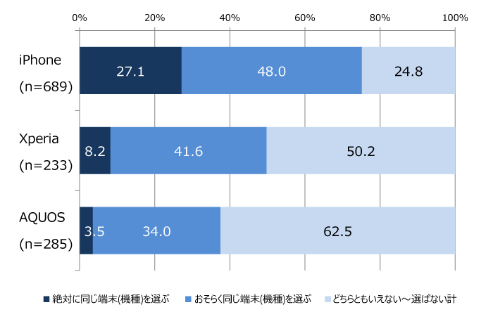 iPhoneユーザーは「絶対に同じ端末(機種)を選ぶ」が27.1%と他機種に比べてダントツに高く、多くの固定ファンを抱えていることが分かります。