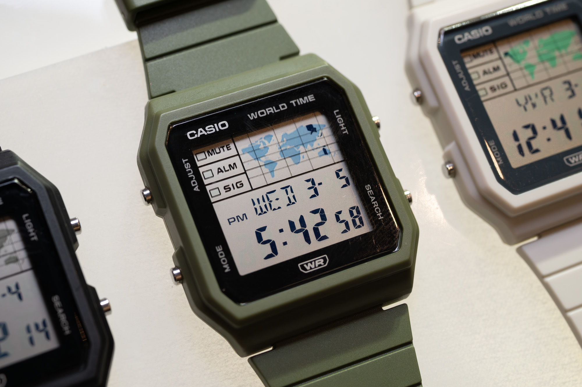このシリーズの最大の特徴は、液晶画面の右上に大きく配置された世界地図です。現在表示しているタイムゾーンが地図上に黒くマッピングされ、視覚的に世界各地の時間を把握できます。また、異なる4都市を登録して表示を切り替える「マルチタイム」機能や、世界48都市(31タイムゾーン、サマータイム設定機能付き)+UTC(協定世界時)の時刻表示が可能な「ワールドタイム」機能を搭載しています。