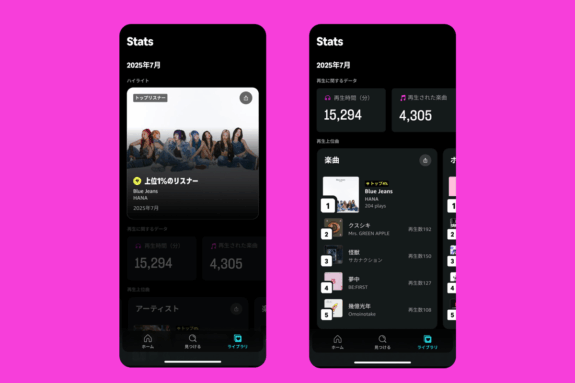 Amazon Musicは2025年8月に、個別ユーザーの再生ログを可視化する新機能「Stats」を全世界でリリースしました。この機能では、月ごとのリスニング履歴「Monthly Recaps」によって、最も聴いたアーティストや曲、ポッドキャスト、再生時間、さらには「Top Listener」バッジなどをまとめて表示します。アプリ内で簡単にアクセスでき、タップひとつでお気に入り曲を再生したり、アーティストのカタログを開くUXも備えています。