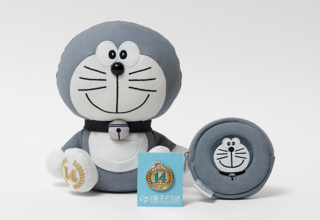 まず、1階ミュージアムショップでは、8月30日から「14周年ピンズ」(770円)と「14周年デニムドラえもんぬいぐるみ」(2,750円)が登場。ピンズはベレー帽姿のドラえもんがひょっこり顔を出す愛らしいデザインで、ぬいぐるみはライトグレーを基調に首輪やしっぽが黒で統一された、上品な仕上がりです。さらに、9月13日からは、同じデニム素材を使った「14周年デニムコインケース」(1,980円)も発売予定です。