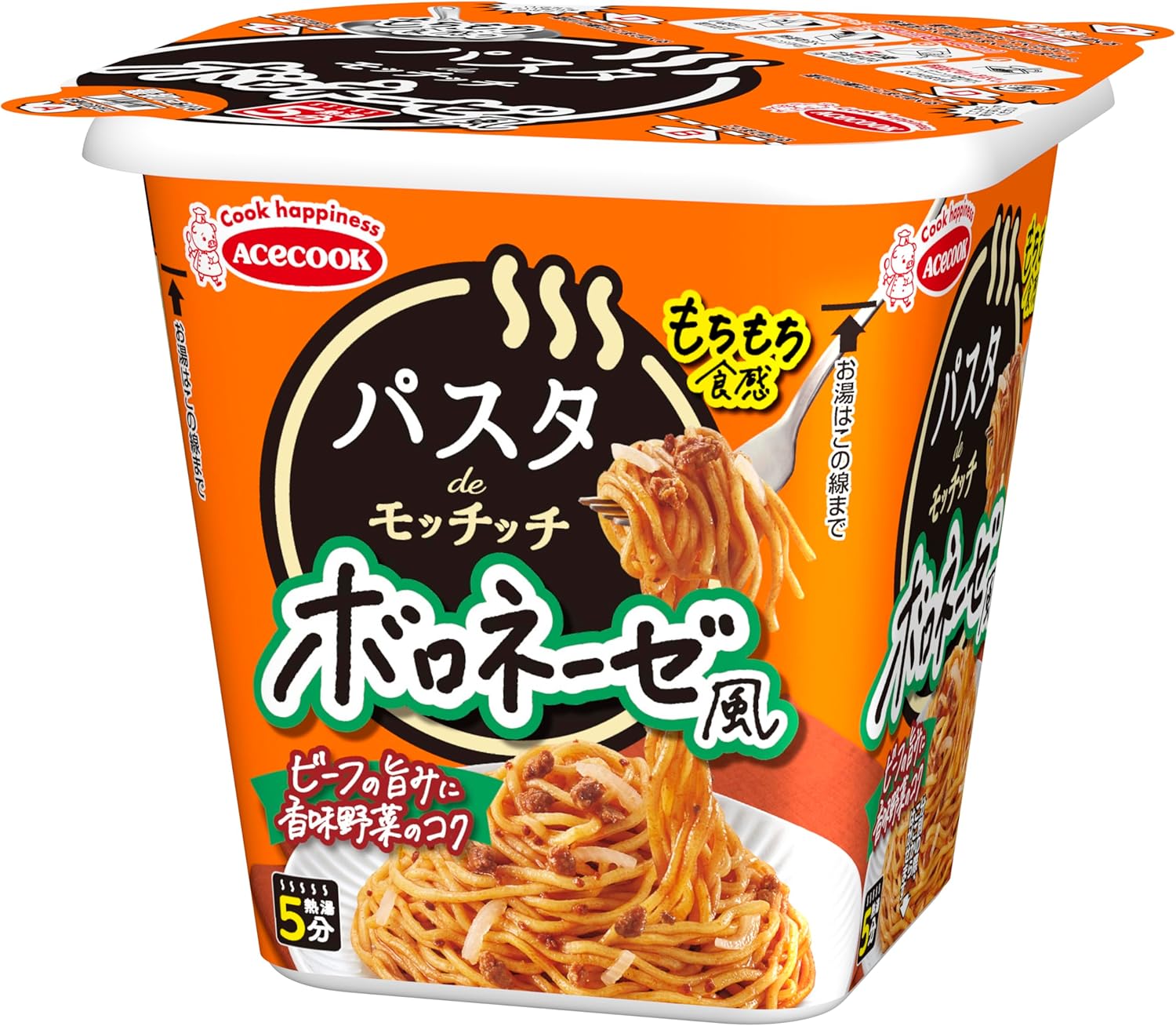 エースコックの新商品「パスタdeモッチッチ ボロネーゼ風」は、ビーフソースをベースに香味野菜の風味を重ねた濃厚な味わいが特徴の即席パスタタイプのカップ麺です。ソースにはトマトの酸味もほんのり感じられ、塩辛さや不快な酸味が強調されすぎることなく、“食べやすさ”が保たれています。