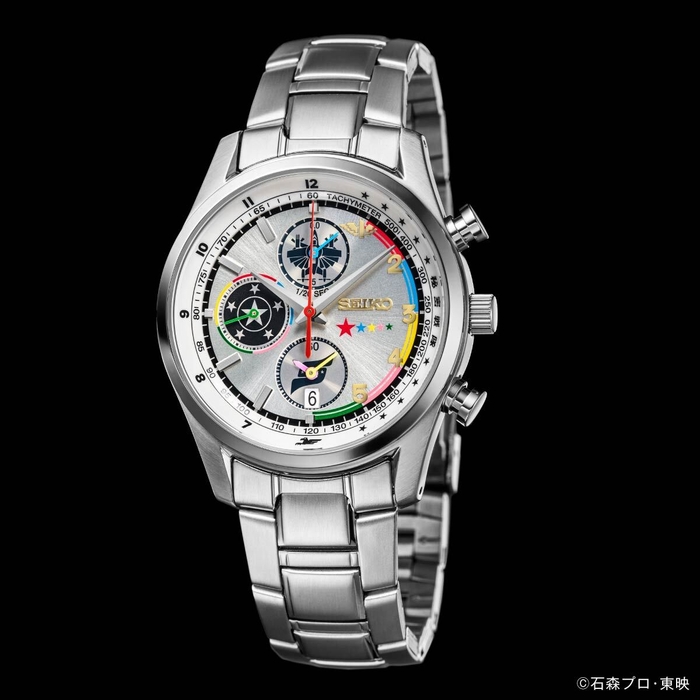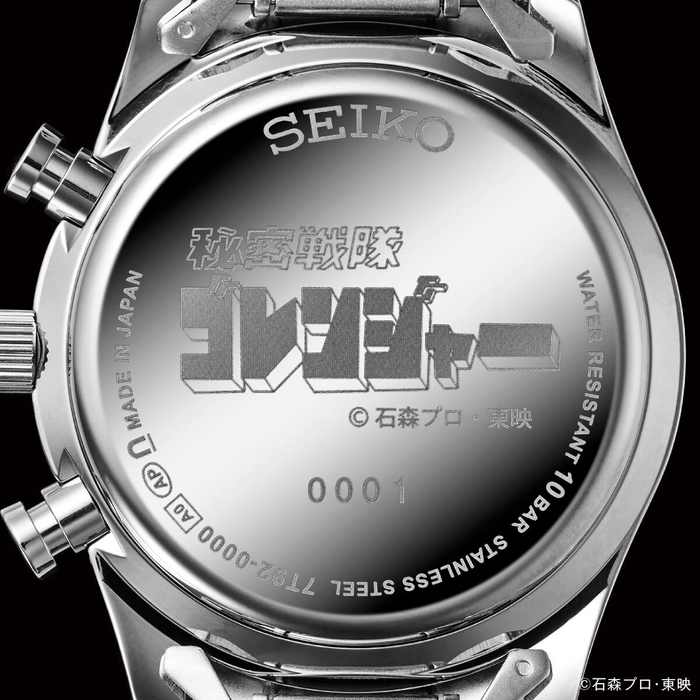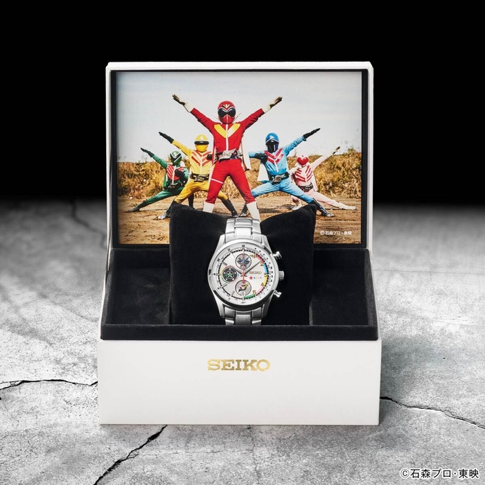 この腕時計は“ゴレンジャーマシーン”を想起させる白銀文字盤に、額の数字を模した金色インデックス、そして5色のラインが配された、ファン心をくすぐる豪華デザイン。ストップウォッチの秒針には大型飛行要塞「バリドリーン」、小秒針には「ゴレンジャーハリケーン」のエンドボールを模した意匠があしらわれ、裏蓋には作品ロゴとエディションナンバー入り。特製の“決めポーズ”ボックスに収められてお届けされます。