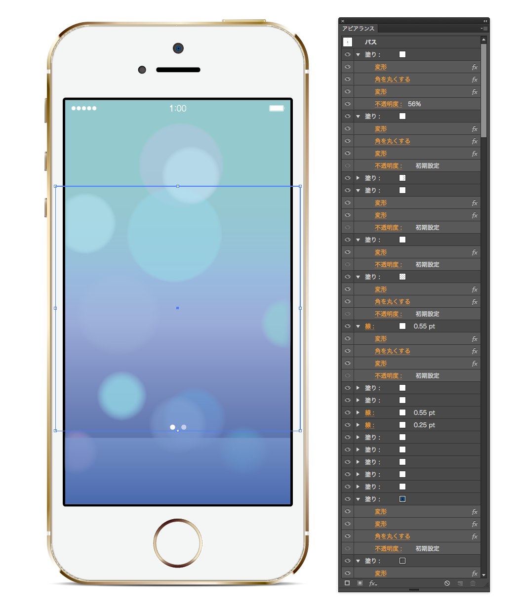 先ずは四角をひとつ作って、そいつに新規で塗りや線をどんどん追加して、効果もどんどん追加して・・・あれよあれよと iPhone 5sが描かれテイキマす!!