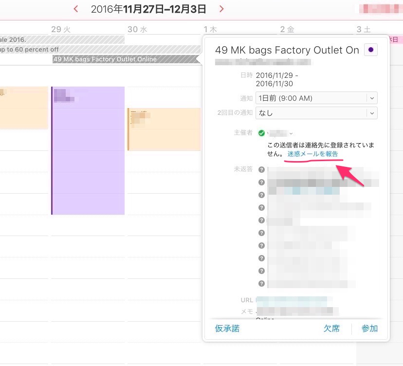 連絡帳に入っていない人から出席依頼は、主催者の欄に「この送信者は連絡先に登録されていません。」との警告が表示され、「迷惑メールを報告」をすることで、スパムカレンダーは自動的に削除されることになります。