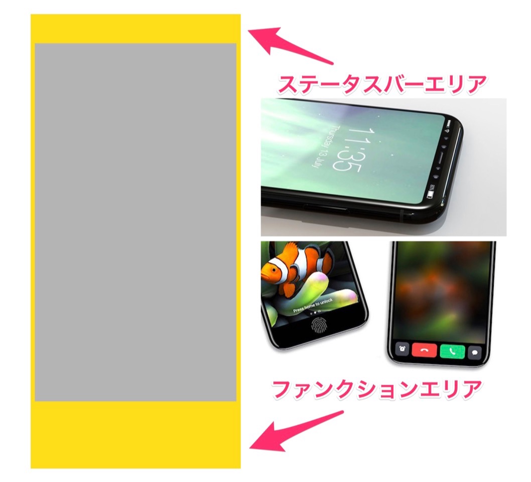 ただ、ボク的にはこんな感じで上部に「ステータスバーエリア」と、下部に「ファンクションエリア」が配置されるんじゃないかと推測しちゃいますね(≧∀≦)b!!