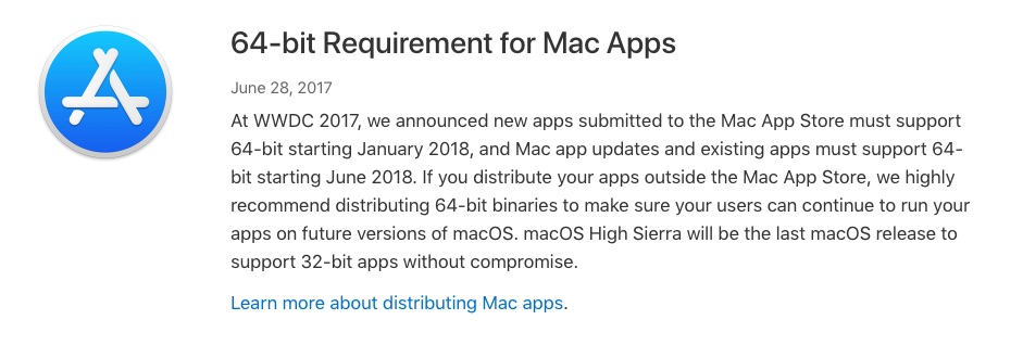 そういえば、昨年2017年6月のWWDC2017で「2018年1月以降、Mac App Storeで配信されるmacOS向けアプリは64ビット対応が必須」とアナウンスしていましたね。