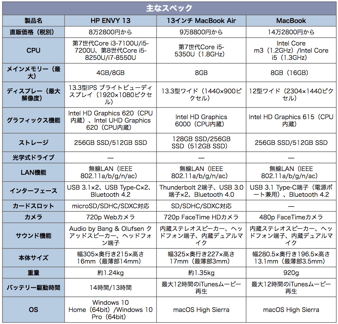上から「MacBook」、「HP ENVY 13」、「13インチ MacBook Air」の順