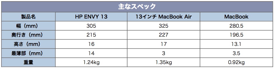 手前から「MacBook」、「HP ENVY 13」、「13インチ MacBook Air」順