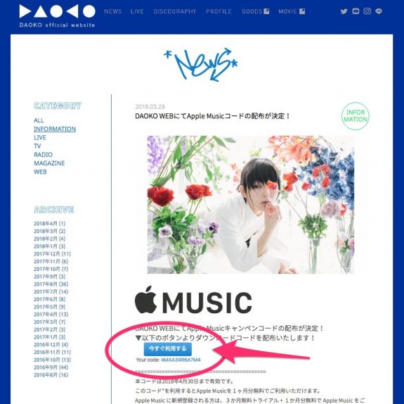 女性シンガーソングライター DAOKOの公式サイトで「Apple Musicの1カ月無料コードプレゼントキャンペーン」が実施中だぞ!!