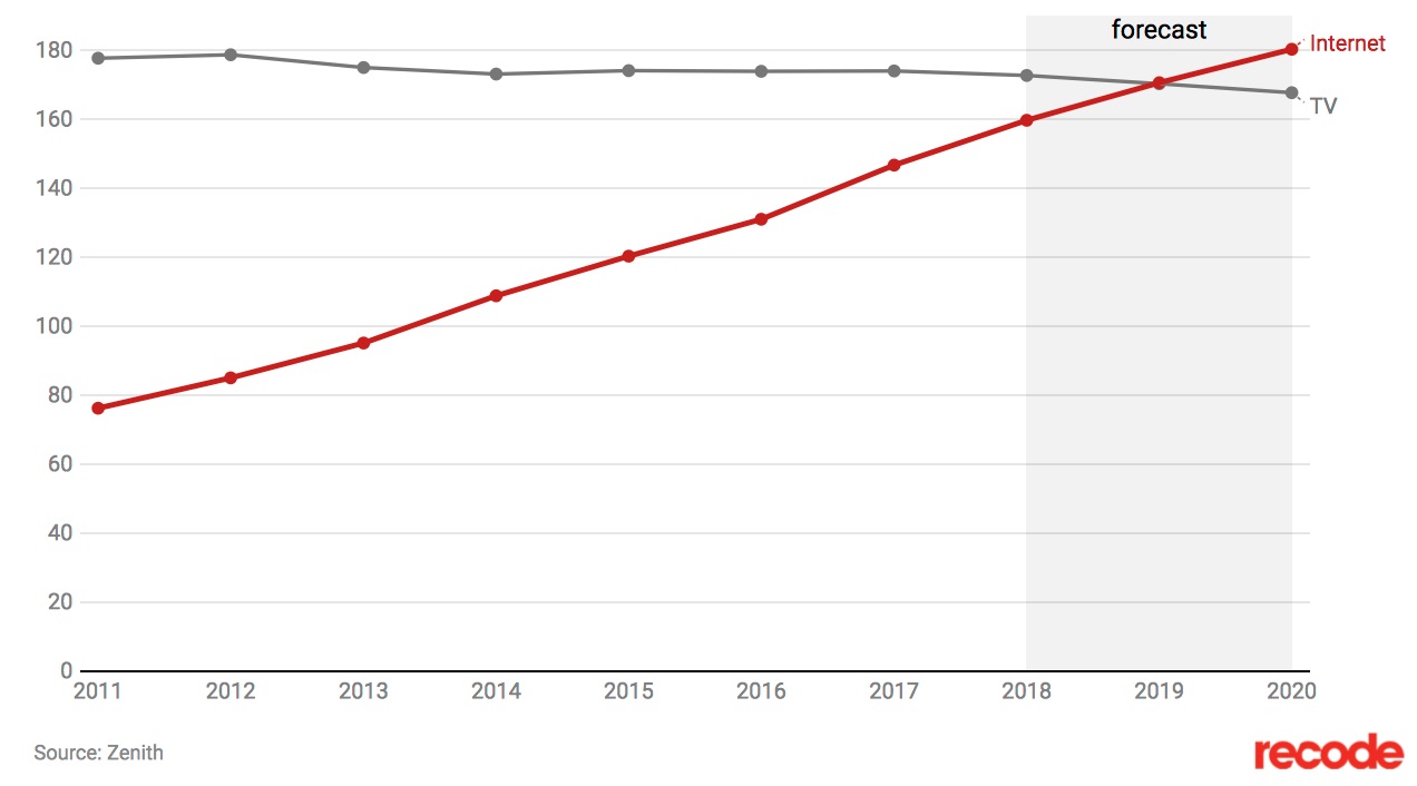 世界のメディア接触時間レポートによると、今年2019年に「インターネット利用時間がテレビ視聴時間を超える」ことになるだろうとのこと。