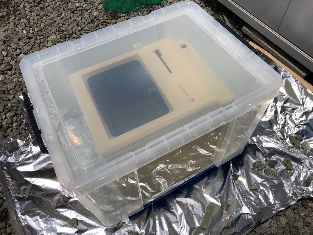 取り外せなかったゴム足だけが化学反応でベトベトになってしまったそうですが、ABS樹脂の変化もなく、Appleロゴのカラーも脱色されず、Mactosh Plus のプリントも問題ないですね(p゚∀゚q)キュキューン
