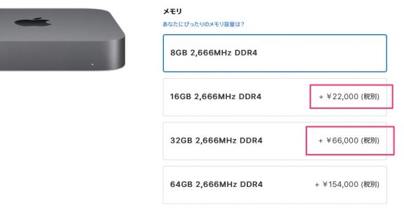 Apple Storeで Mac mini (Late 2018)を購入する際、メモリをアップグレードするには 16GBで22,000円(税別)、32GBで66,000円(税別)になります。
