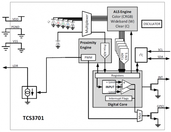 AMSが発表したセンサ「TCS3701」は、暗い場所でも正確に作動する「照度センサー」と「赤外線近接センサー」のコンポーネント(構成部品)で、サイズが薄さ「0.5mm」「2 x 2.5mm角」ほど、しかも OLEDディスプレイ越しでも外部の情報を正確に取得できるため埋め込み可能とのこと。