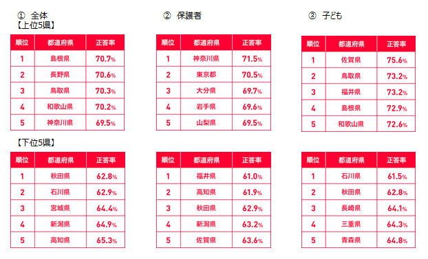 逆に正答率の低い都道府県トップ3は、秋田県(62.8%)、石川県(62.9%)、宮城県(64.4%)でしたToT