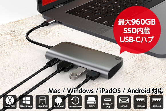 さらに魅力的なのは、外部ストレージとして使えるのはもちろん macOSの自動バックアップ機能「TimeMachine」対応だったり、macOSのほかWindows 10、iPadOSにも対応、4K対応のHDMIポート搭載、SSD容量は960GB、480GB、240GB、120GBの4種類が用意されていたりと、どんなユーザーにもピッタんこカンカン!!