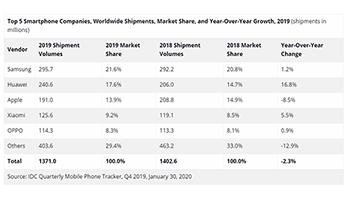 18年には、わずか0.2ポイント差でAppleが2位でファーウェイが3位でしたが、19年は中国で好調だったファーウェイがAppleを抜いてます。