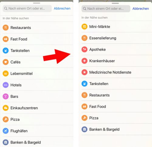 左の画像がアップルのサイト上の画像、右がボクのiPhoneのスクショで、確かに「薬局」「病院」「急病診療所」「フードデリバリーサービス(食品宅配サービス)」などが上位に表示されていますね(≧∀≦)b!!