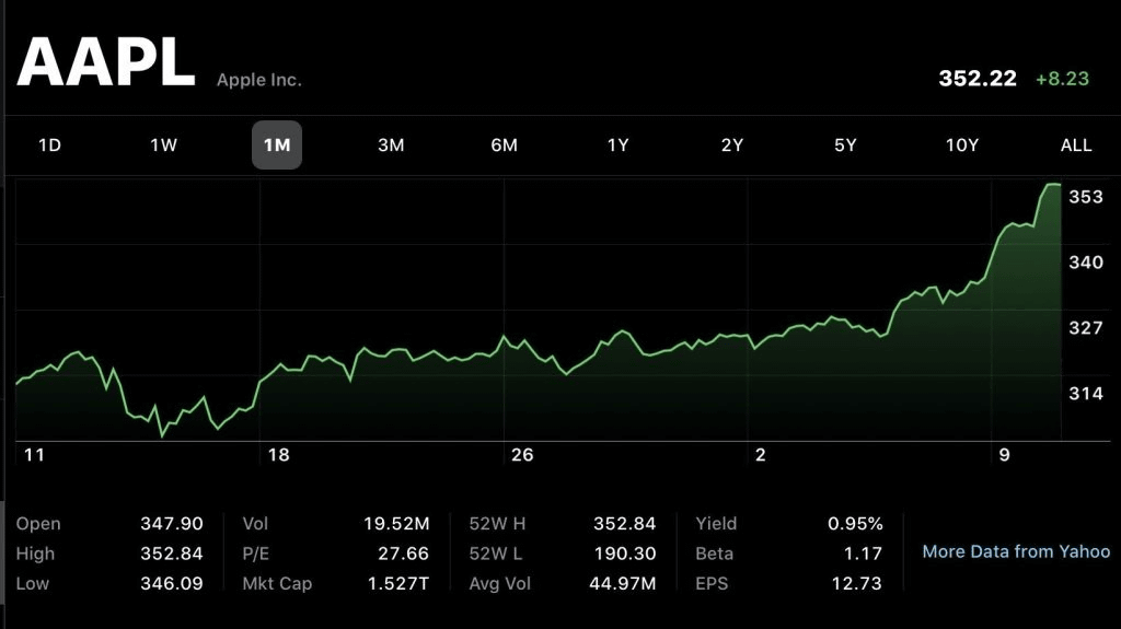 平時ならまだ知らず、新型コロナウイルスや人種差別抗議デモなんかで、世界的恐慌でものすごい逆行の中にもかかわらず、Appleの株価は上昇し続け352.22ドル(約38,000円)に到達し、米国人未到の時価総額1兆5000億ドル超を果たすという快挙を成したワケです!!