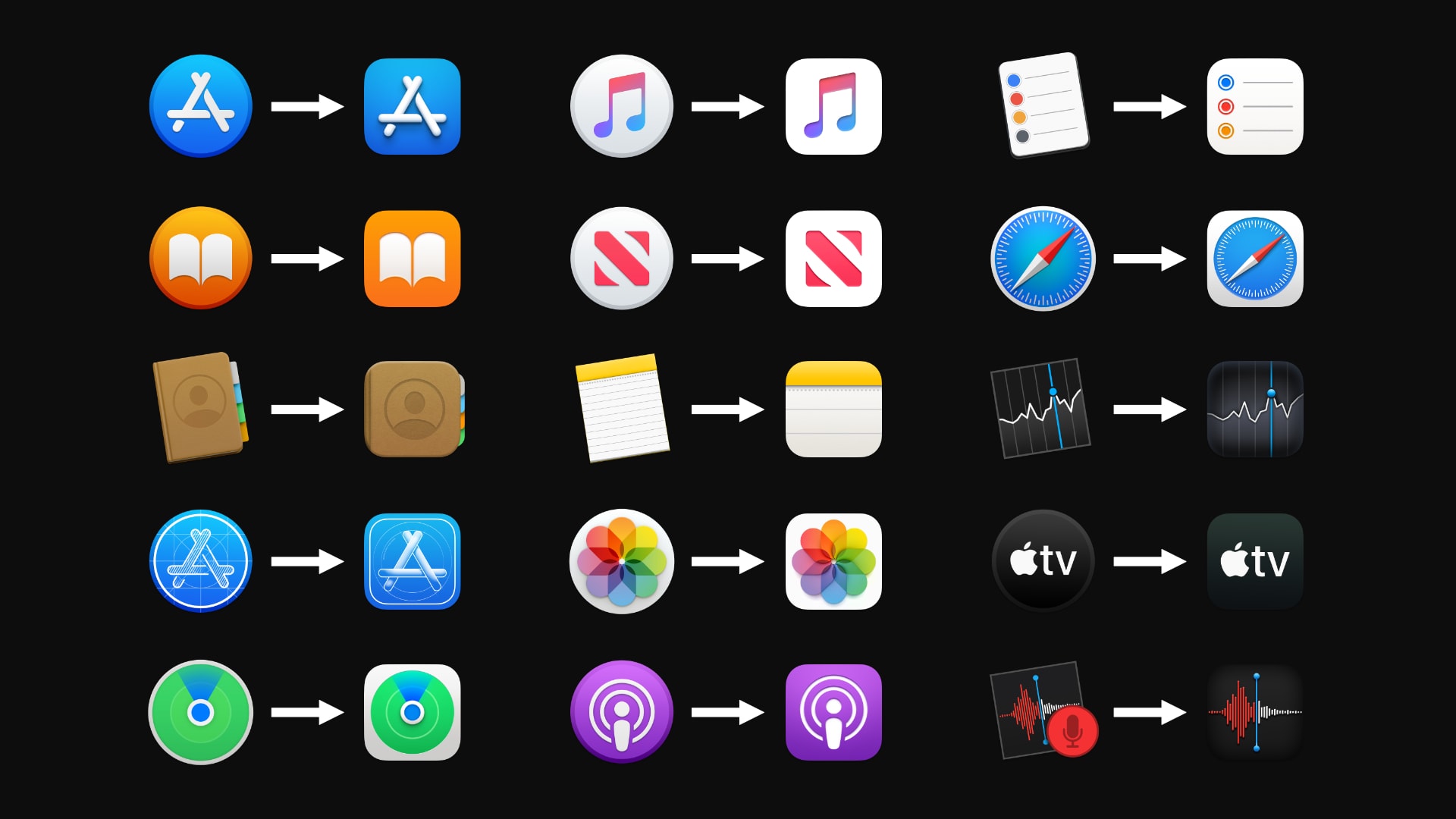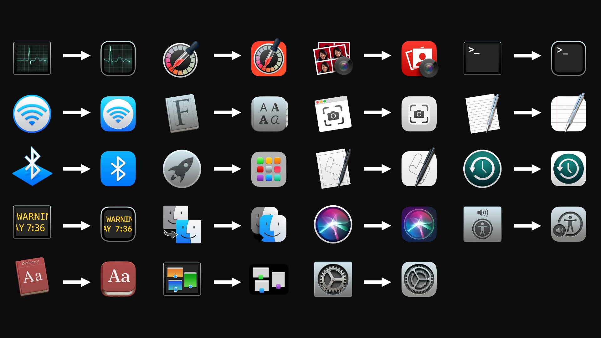 なのでアイコンはiOS風のものに変わるようナノですが、アイコンがどのように変更されるのか、Big SurのアイコンとCatalinaのアイコンとを比較できるページを、Cult of Macが公開してたのでご紹介です。