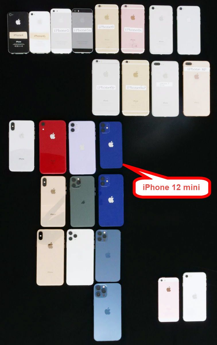 1番上の段が左からiPhone 4、iPhone 4s、iPhone 5、iPhone 5s、iPhone 6、iPhone 6s、iPhone 7、iPhone 8で、2段目にあるのは直上にあるiPhoneの大画面モデルで、左からiPhone 6 Plus、iPhone 6s Plus、iPhone 7 Plus、iPhone 8 Plus。3段目はFaceIDが初めて登場したiPhone X以降のモデルで、左からiPhone X、iPhone XR、iPhone 11、iPhone 12 mini。赤色のiPhoneXRの下に並んでいるのは同じタイミングで発表された、iPhone XSとiPhone XS Max。紫のiPhone11の下には順にiPhone 11 Pro、iPhone 11 Pro Max。iPhone 12 miniの下には順にiPhone 12、iPhone 12 Pro、iPhone 12 Pro Maxが並びます。右下に離れて置かれているのは左から第1世代iPhone SEと第2世代iPhone SEです
