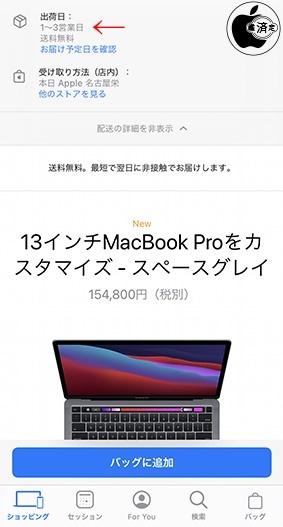 Appleが、M1チップ搭載MacBook Pro「MacBook Pro (13-inch, M1, 2020)」の納期を「1〜3営業日」に短縮しています。 Apple Storeでの店頭受取は、当日または明日受け取り可能な店舗があります