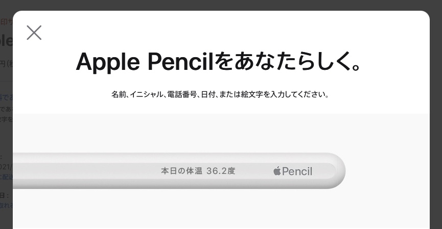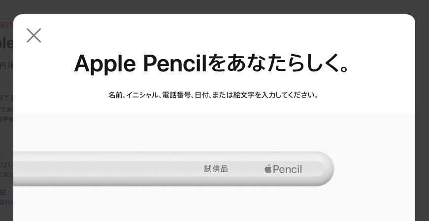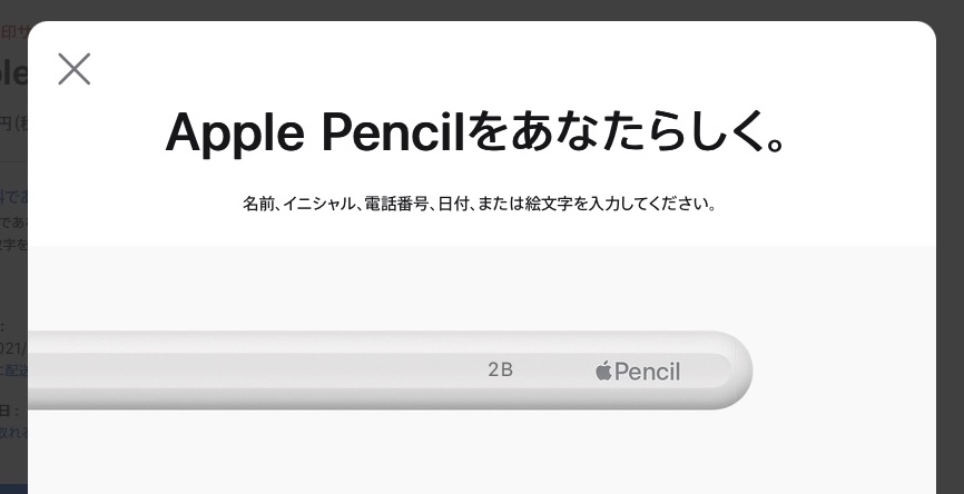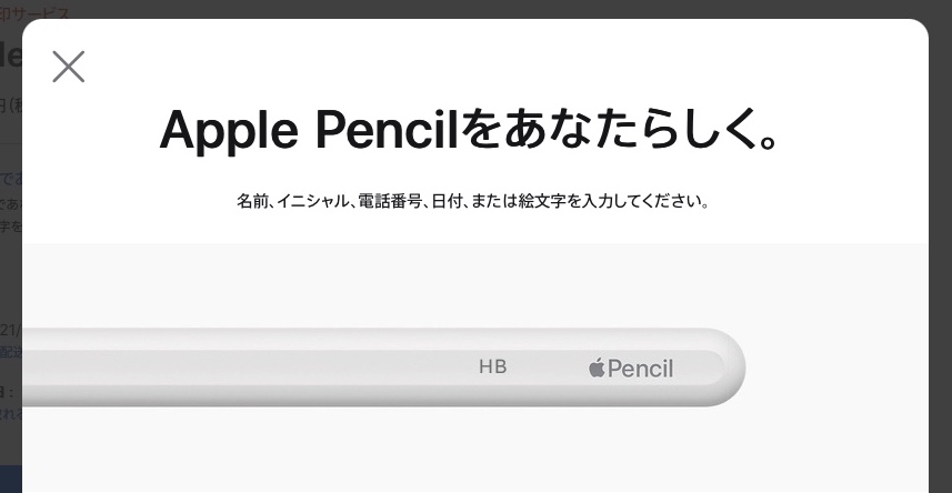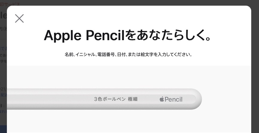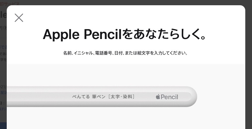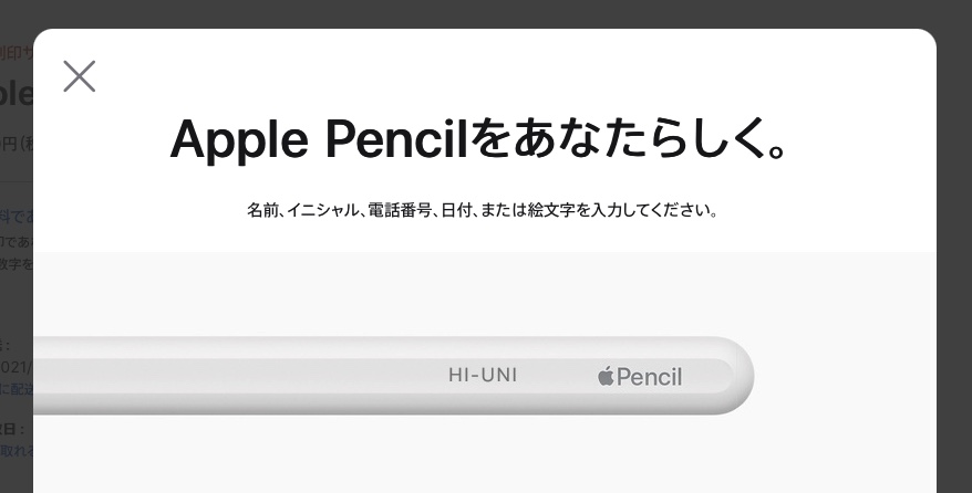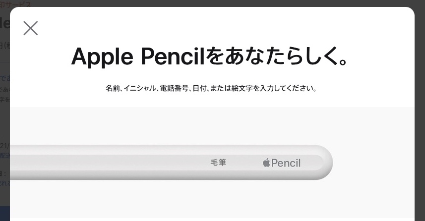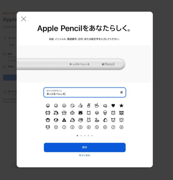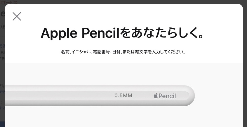 Apple Pencilをアップルの公式サイトから注文すると、刻印サービスを受けられ、絵文字、テキスト、数字を組み合わせて世界に一つだけのApple Pencilにできちゃうんですけど、この刻印サービスの入力画面がよくできていて、文字を入力するとリアルタイムで完成イメージを確認することができます。